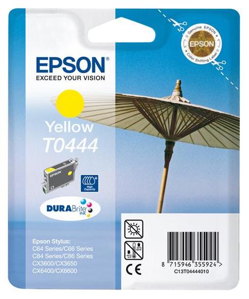 Якщо ви шукаєте надійний оригінальний картридж для комфортного друку в домашніх умовах, то Epson C13T04444010 - один з кращих варіантів. Він наділений достатнім об'ємом, з ресурсом 400 сторінок А4 від однієї заправки. В якості витратних матеріалів в принтері використовується оригінальне чорнило, жовтого кольору на пігментній основі, що наділене покращеною якістю. Картридж виготовлявся для сумісного використання зі струменевими принтерами Epson Stylus C84 / C84 Photo Edition / C86 / C86 Photo Edition / CX6400 / CX6600. Завдяки зручній конструкції та компактним розмірам, особливих труднощів при встановленні чи заміні у вас не буде. Epson C13T04444010 - саме той картридж, що потрібен для продуктивної роботи вашого принтера.
