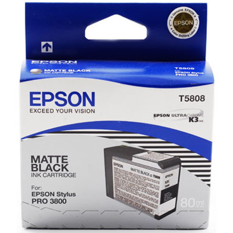 Оригінальний картридж для струменевого друку Epson T5808 чорного кольору. В даному картриджі використовується пігментний барвник Epson UltraChrome K3. Чорнила цього типу ідеально підійдуть як для високоякісного монохромного друку, так і для графічих зображень або ж фотодруку. Світлостійкість у даних чорнил досягає двухсот років. Ресурс складає 410 сторінок. Сумісний з принтером Epson Stylus Pro 3800