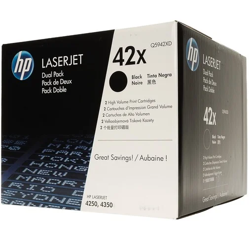 HP №42X - комплект із двох оригінальних картриджів чорного кольору. Встановлюється картридж у професійні принтери HP, моделей LJ 4250 та 4350. Завдяки двом картриджам Ви зможете віддрукувати до 20000 аркушів формату А4, при заповненні їх елементами на 5%.
