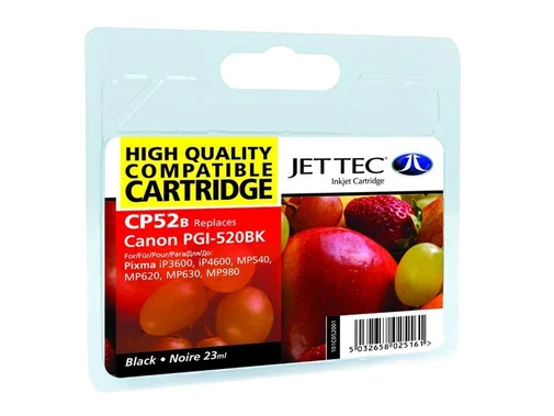 Jet Tec CP52B - якісно виконаний сумісний картридж чорного кольору. Призначений для встановлення у принтери і багатофункціональні пристрої Canon, що використовують оригінальний картридж Canon PGI-520. Максимально сумісні чорнила та фізичні розміри картриджу, гарантують легкість його встановлення у пристрій та гарантують отримання висококласних відбитків із насиченим чорним кольором. Об'єм чорнил, що у картриджі, дозволить Вам отримати до 350 аркушів формату А4, при заповненні їх елементами на 5%.