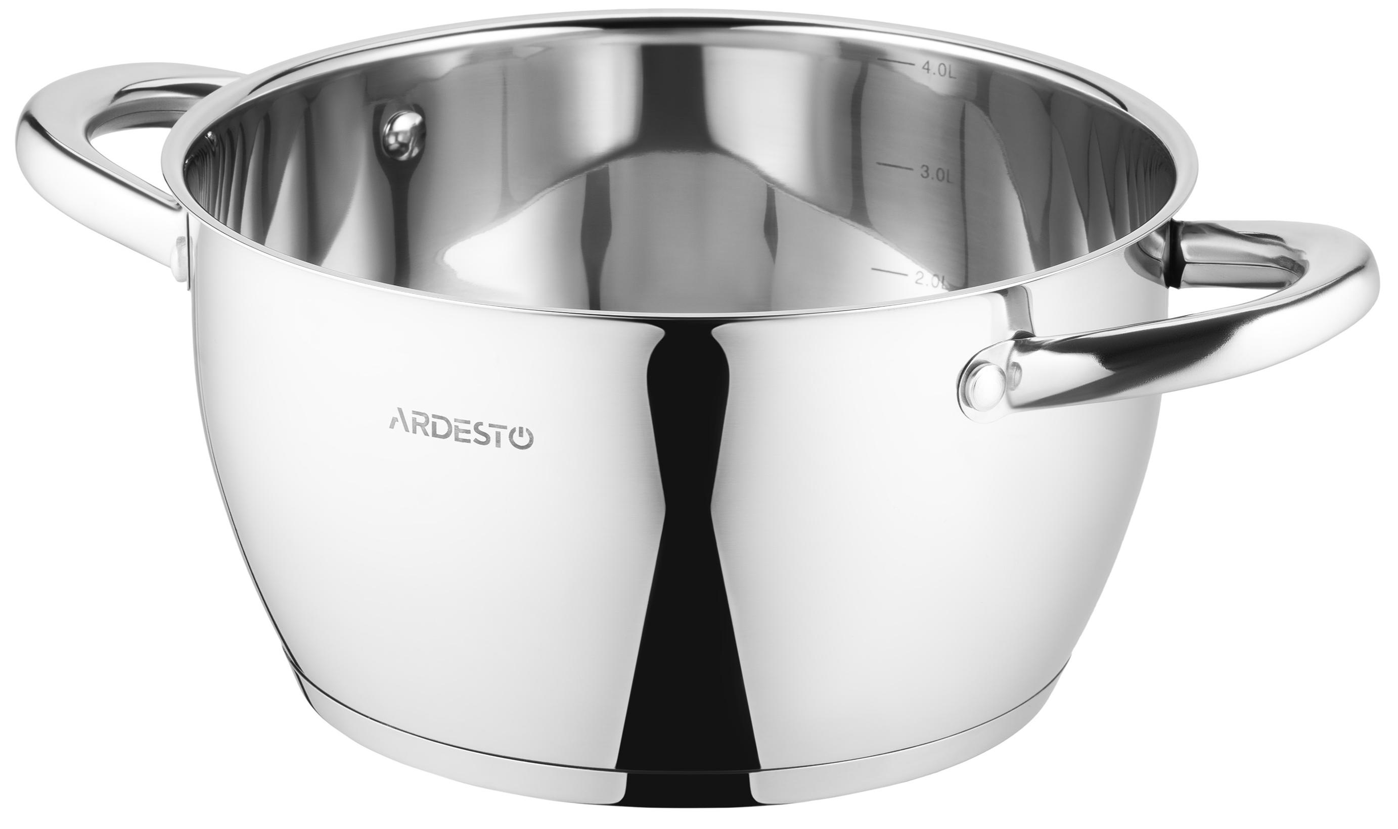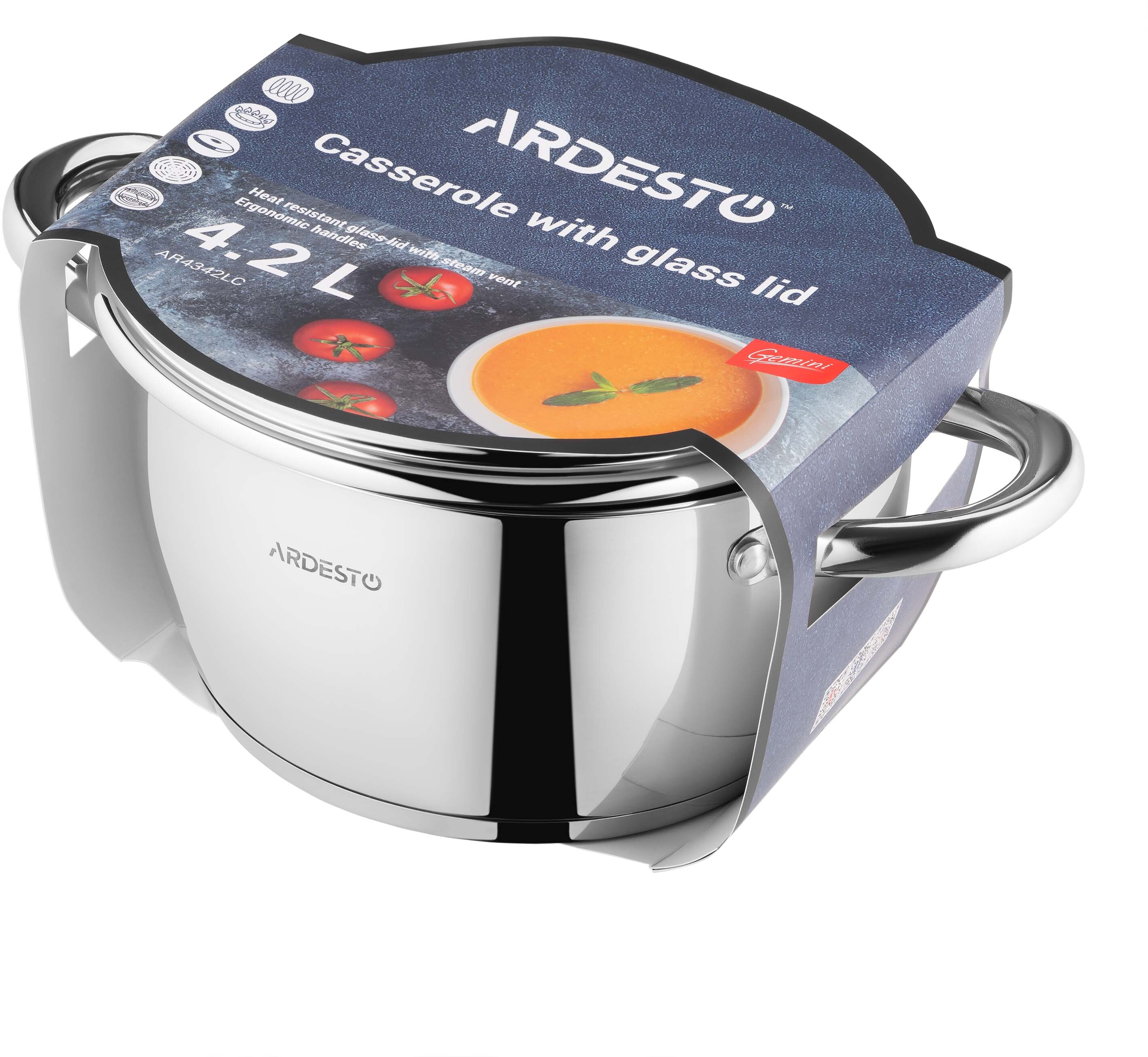 Каструля ARDESTO Gemini Lucca об’ємом 4,2 л – це місткий і надійний посуд для приготування великих порцій супів, рагу чи компотів. Виріб виготовлено з нержавіючої сталі, гарантуючи довговічність і безпеку. Діаметр каструлі становить 22 см, висота – 12 см, а товщина стінок – 0,5 мм і дна 2,9 мм, що забезпечує стабільне нагрівання без перегрівання окремих зон. Зі скляною кришкою з отвором для пари забезпечено контроль процесу приготування з дотриманням температурного балансу. Мірна шкала всередині корпусу додає точності під час роботи з рідинами. Руків’я з нержавіючої сталі зручно лежать у руці та залишаються безпечними навіть за тривалого нагрівання. Каструля сумісна з усіма типами плит – газовими, електричними, склокерамічними, галогенними та індукційними. Рекомендовано миття в посудомийній машині.