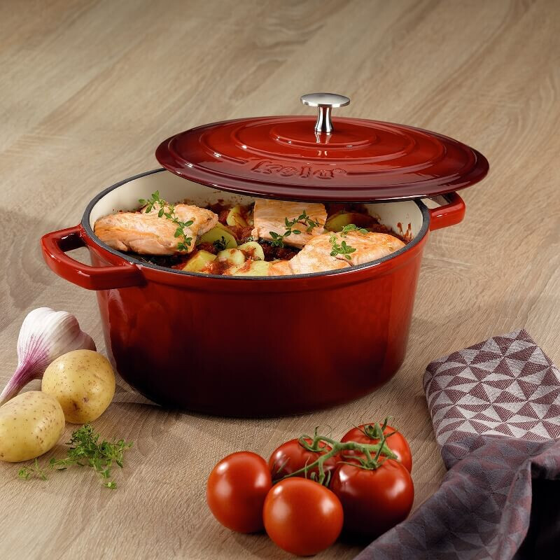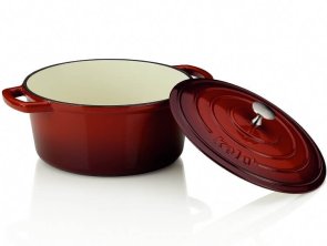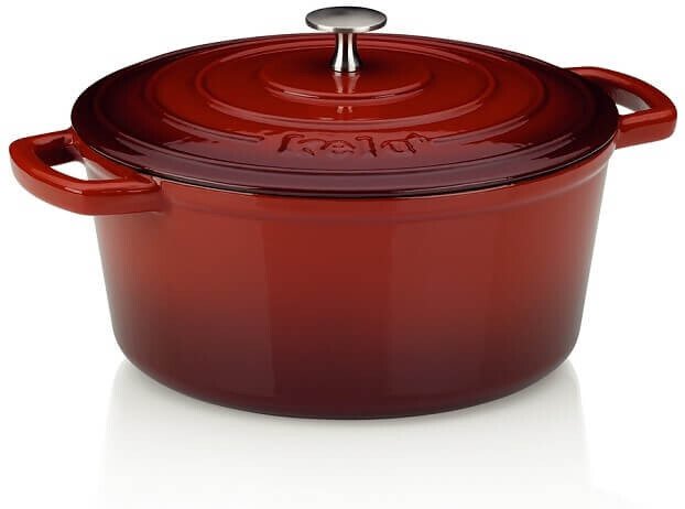 Німецький виробник посуду та начиння для кухні KELA, представляє дуже модну і довговічну каструлю з кришкою KELA Calido. Червона каструля виготовлена з чавуну і покрита емаллю бежевого кольору всередині, має глянсове покриття. Вона ідеально підходить як для обсмажування (до 300 ° C), так і для тривалого тушкування м'яса у власному соку. Емаль повністю нейтралізує головний недолік чавуну - зовнішню пористість, при цьому зберігаються всі переваги: висока теплоємність та хороша теплопровідність. У ній ви зможете готувати рагу і густі супи, тушкувати голубці і тефтелі, експериментувати з соусами. Також емальований посуд не боїться неприємних запахів і сторонніх смаків, не потребує попередньої підготовки перед першим застосуванням. Її досить вимити з миючими засобом. Чавунна кришка має зручну ручку. Підходить для всіх джерел тепла, включаючи індукційні. Ця каструля є частиною великої серії посуду!