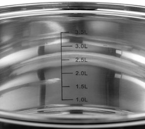 Загальновідомо, що час, витрачений на приготування страви, і правильна кількість інгредієнтів - це чи не основні ключі до успіху кухаря. Для вашої зручності і для того, щоб ви витрачали мінімум часу на таке малоприємне заняття, як миття посуду, всередині, на борт нашої каструлі, нанесена функціональна мірна шкала. Ви зможете швидко і точно відміряти необхідну кількість рідини та ретельно контролювати її рівень. Приготовані вами страви будуть чудові на смак, і до того ж, ви заощадите час на миття посуду!