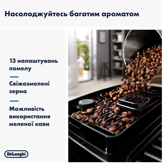 Кавомашина оснащена вбудованою конічною кавомолкою зі сталевими жорнами, яка дозволяє обрати один з 13 ступенів помелу. Кавомолка відкалібрована зі 100% точністю, тож ви можете бути впевнені в якості та міцності вашого напою. Ємність для зерен вміщає в себе 250 г зерен ароматних кавових бобів. Також однією з переваг даної кавомашини є можливість використання попередньо меленої кави.