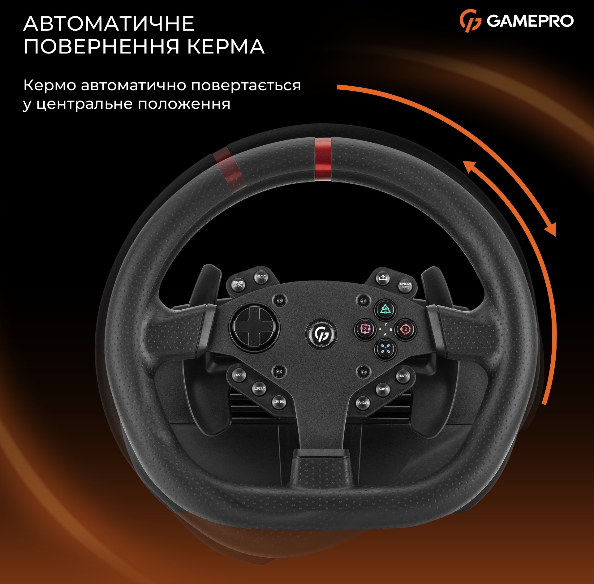 GamePro RW070PM - це ігрове кермо діаметром 270 мм пропонує справжній ефект присутності за кермом спортивного боліда. Воно оснащене технологією інтелектуального силового зворотного зв'язку, яка автоматично повертає кермо в центральне положення при включенні живлення.