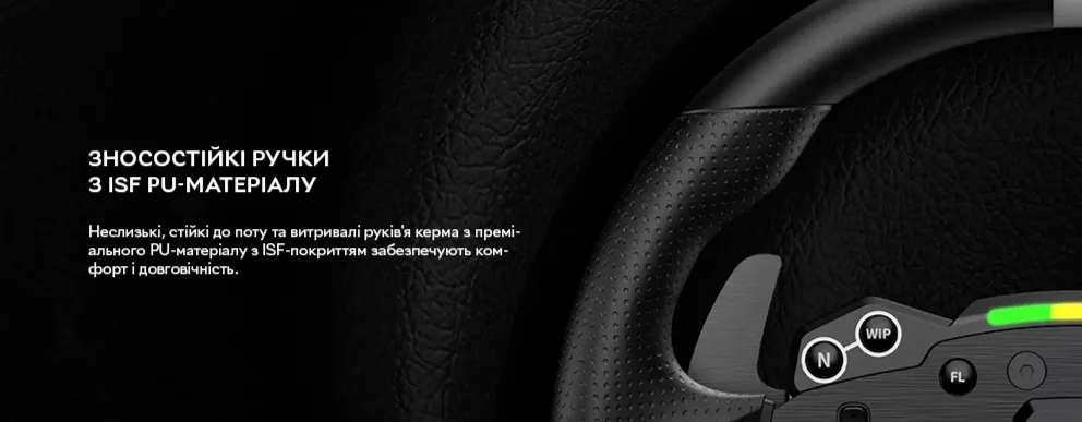 Кермо оснащене двигуном прямого приводу з крутним моментом 3,9 Нм, що забезпечує стабільну й точну передачу зусилля, відтворюючи відчуття керування справжнім автомобілем. Корпус виконаний з авіаційного алюмінієвого сплаву, а ручки керма з міцного матеріалу ISF PU забезпечують комфорт і довговічність.