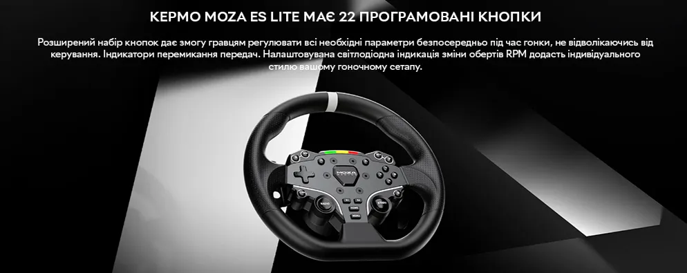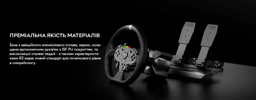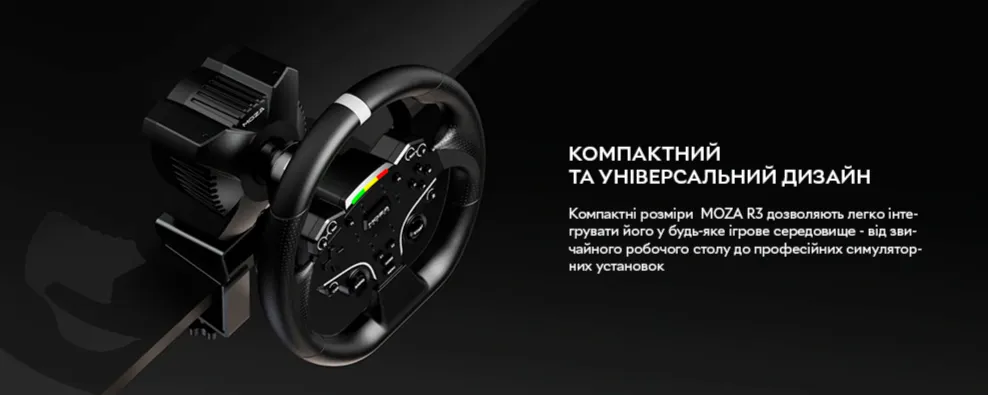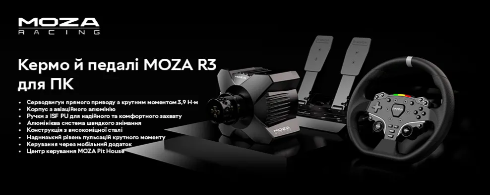 Комплект включає кермо R3 з передовою системою зворотного зв’язку та педалі MOZA SR-P Lite для чутливого й реалістичного керування. Завдяки компактному дизайну він ідеально підходить як для настільних, так і для спеціалізованих установок для перегонів.