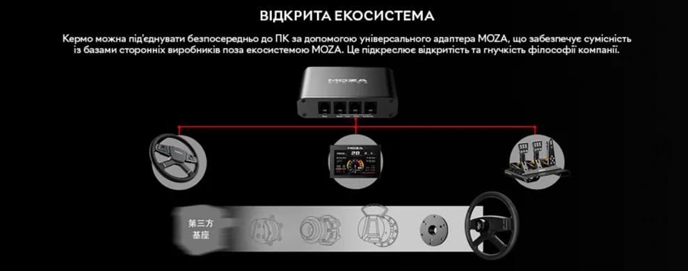 Комплект можна безпосередньо підключити до ПК за допомогою універсального адаптера MOZA, що робить його сумісним зі сторонніми базами поза екосистемою MOZA, демонструючи філософію відкритої та інклюзивної екосистеми MOZA.
