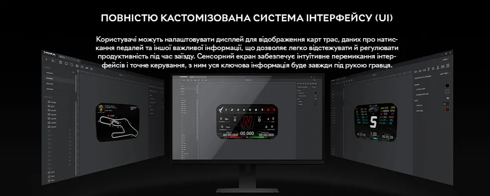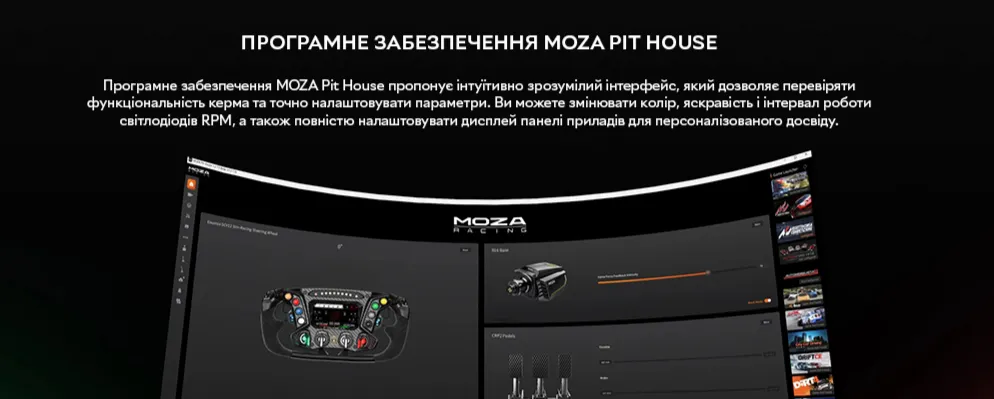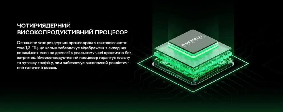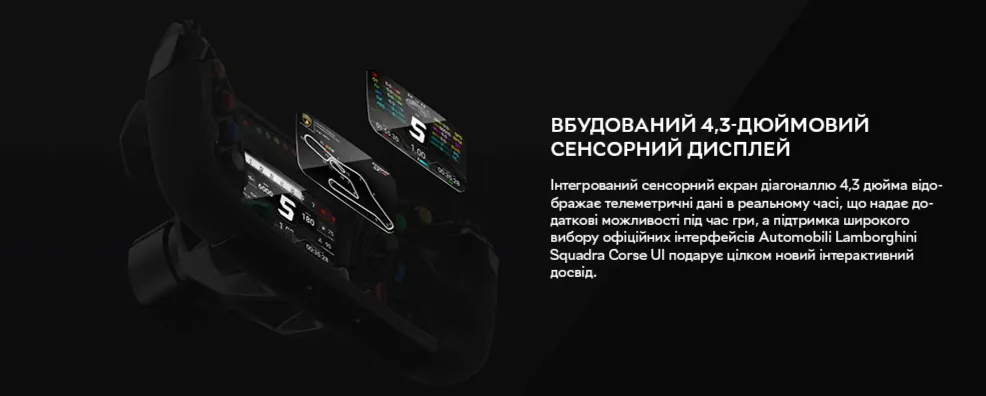 Серце керма — чотириядерний процесор 1,3 ГГц — забезпечує практично миттєве відображення даних на вбудованому 4,3-дюймовому сенсорному LCD-екрані. Через нього можна перемикатися між офіційними інтерфейсами Lamborghini Squadra Corse або створювати власні у програмі MOZA Pit House. Функція інтелектуальної телеметрії збирає ключові дані про швидкість, оберти та позицію на трасі — для аналізу та вдосконалення навичок після гонки.