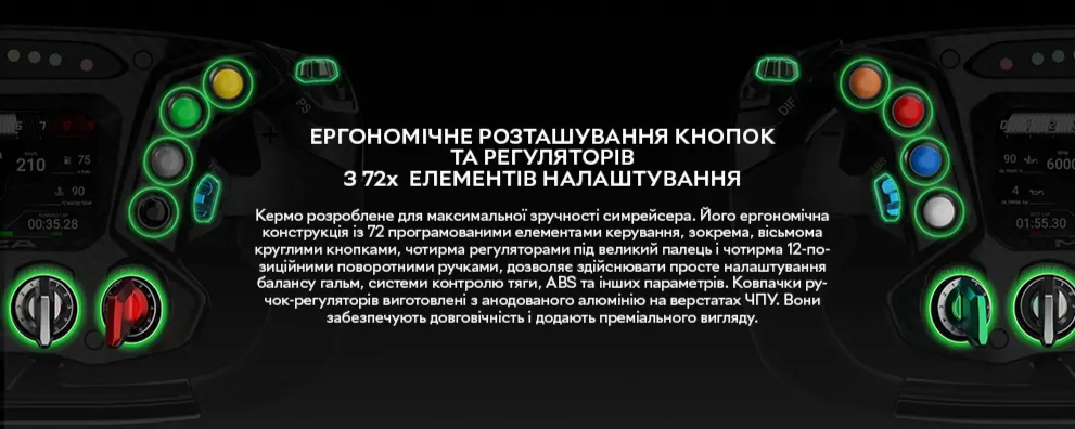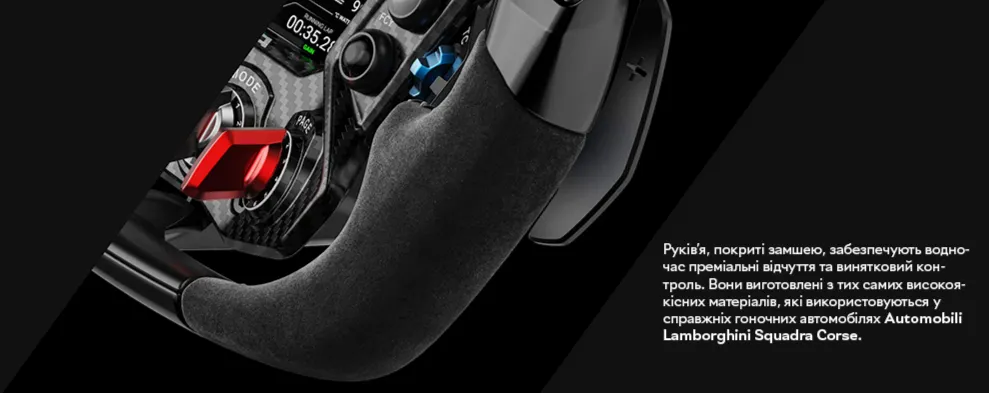 Якість матеріалів одразу відчувається в руках: лицьова панель виготовлена з 3D-плетеного карбону, а корпус — з алюмінієвого сплаву, обробленого методом CNC-фрезерування. Така конструкція забезпечує виняткову міцність при мінімальній вазі. Руків'я обтягнуті замшею преміум-класу — точнісінько як у реальних болідах Lamborghini, — що дає надійне зчеплення та комфорт навіть у тривалих сесіях.