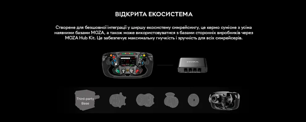 Кермо кріпиться за допомогою системи швидкого під'єднання MOZA Quick Release з алюмінієвого сплаву: заміна займає лічені секунди і не потребує інструментів. MOZA Racing Lamborghini Essenza SCV12 сумісна з усіма колісними базами MOZA, а через адаптер MOZA Hub — і з базами інших виробників, що робить її універсальним вибором для будь-якого симрейсерського стенду.