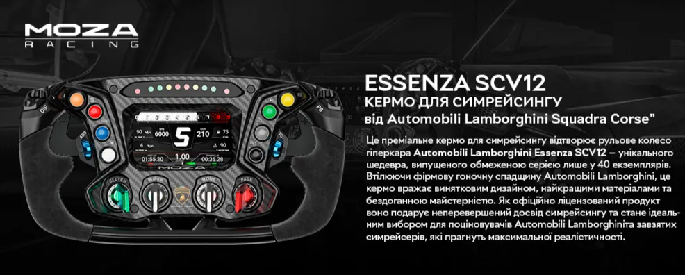 MOZA Racing Lamborghini Essenza SCV12 — це преміальне ігрове кермо діаметром 310 мм, створене у співпраці з легендарним автовиробником Automobili Lamborghini. Воно є точною реплікою керма гіперкара Essenza SCV12 і призначене для тих, хто прагне максимального реалізму у симрейсингу. Це не просто аксесуар — це занурення у світ справжніх гонок Lamborghini Squadra Corse.