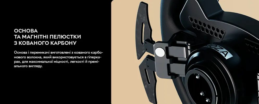 Виготовлений з авіаційного алюмінію обід керма та кована карбонова опорна пластина гарантують виняткову міцність, легкість і довговічність, а нековзка та приємна на дотик рукоятка з натуральної шкіри створює оптимальний комфорт під час гри