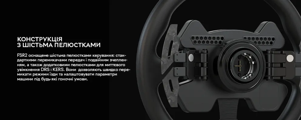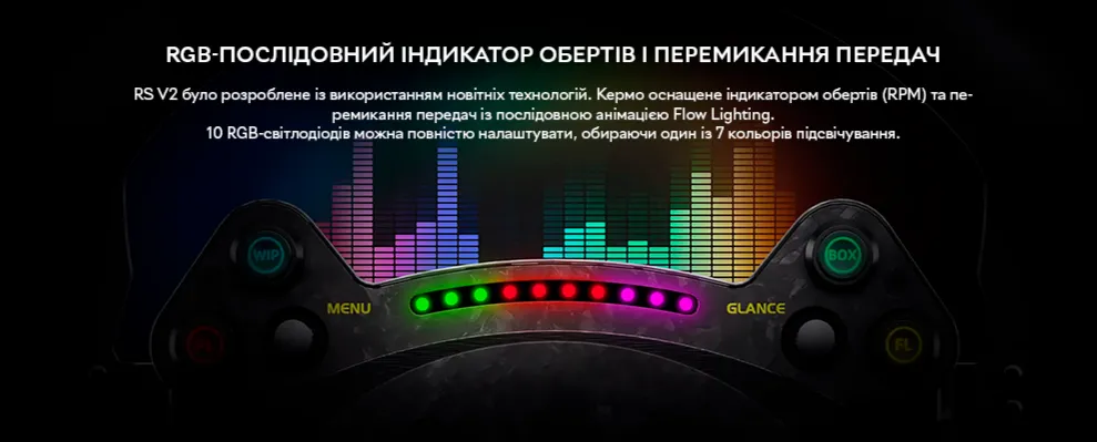 Десять механічних програмованих кнопок з підсвічуванням дають змогу налаштувати необхідні функції безпосередньо на кермі, що дуже зручно під час перегонів. Два універсальні джойстики та два 20-сегментні поворотні перемикачі дозволяють легко виконувати складні ігрові маневри.