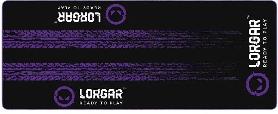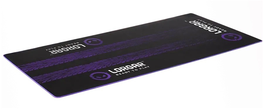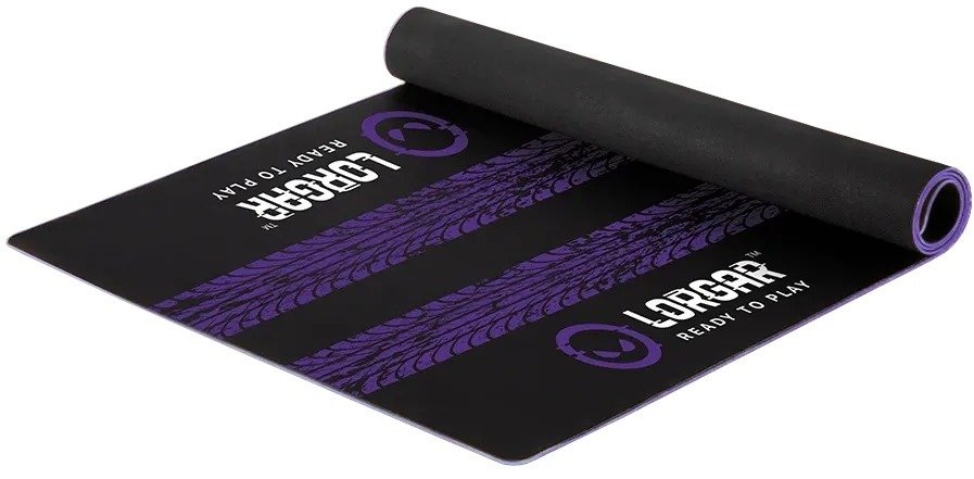 Зносостійка верхня поверхня та прошиті (обметані) краї забезпечують довговічність: килимок зберігає форму і зовнішній вигляд навіть після багаторазового складання, скручування для зберігання та щоденного використання під важким обладнанням. Візуально виріб витриманий у фірмовому чорно-фіолетовому кольорі з малюнком протектора гоночної шини та логотипом Lorgar. Килимок виготовлений зі 100% перероблюваних матеріалів.