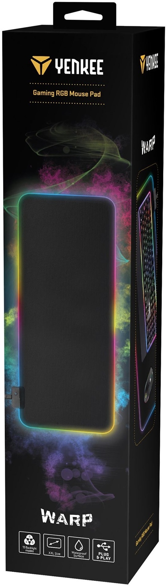 Особливістю Yenkee YPM 3006 WARP є RGB-підсвічування по краях із 13 режимами, включаючи 7 статичних кольорів і 6 динамічних RGB-ефектів. Керування підсвічуванням просте — достатньо натиснути кнопку для зміни режиму чи вимкнути його, утримуючи кнопку 3 секунди. Два рівні яскравості дозволяють налаштувати атмосферу за вашим бажанням. Живлення здійснюється через micro USB кабель що додає зручності у використанні.