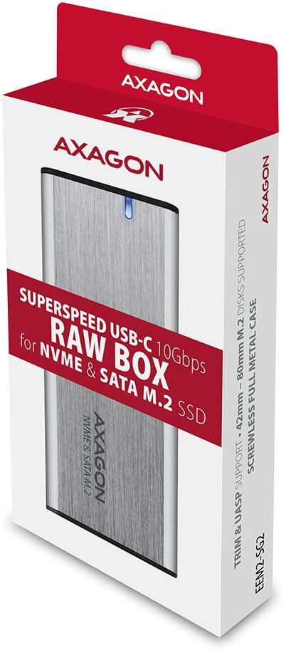 AXAGON EEM2-SG2 — це найкомпактніша та найлегша зовнішня кишеня з інтерфейсом USB 10 Гбіт/с, яка підтримує одночасно M.2 NVMe та M.2 SATA SSD будь-якої місткості. Завдяки реальній швидкості передачі до 1 000 МБ/с ви отримуєте блискавичний доступ до даних, незалежно від того, який саме M.2 диск встановлено — протокол визначається автоматично.