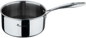 Цей ківш діаметром 22 см і висотою 10 см виготовлений із нержавіючої сталі 18/10, що гарантує рівномірний нагрів і тривалий термін служби. Ківш виконаний у чорному металічному кольорі, який додає йому сучасного вигляду. Оснащений кришкою з нержавіючої сталі, він забезпечує додаткову функціональність. Антипригарне покриття PPG ETERNA спрощує процес очищення, хоча миття в посудомийній машині не рекомендується. Ківш підходить для всіх типів плит, включаючи індукційні.