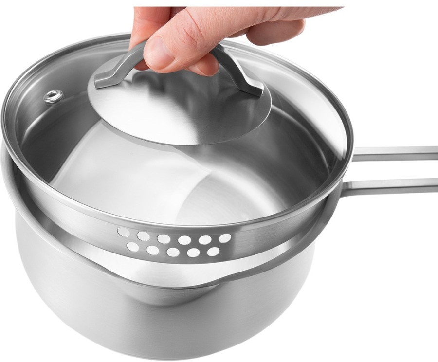 Ексклюзивний дизайн дна, розроблений в Італії. Матеріал — високоякісна нержавіюча сталь 18/10. Технологія IMPACT — потрійне вштамповане термоаккумулятивне дно з прошарком з алюмінію. Ручка — зручна, з нержавіючої сталі. Можна мити в посудомийній машині. Кришка з жароміцного скла з отвором для випуску пари і спеціальним широким металевим ободом з отворами для зручного зливу рідини. Зручні носики для зливу рідини. Відмітки літражу для зручності використання. Підходить для всіх типів плит, включаючи індукцію.