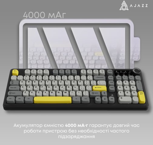 Ajazz AF98 PLUS підтримує дротове підключення, бездротовий режим 2.4 GHz та Bluetooth, що дозволяє легко перемикатися між різними пристроями. Вбудований акумулятор місткістю 4000 мА-год забезпечує тривалий час автономної роботи без частих підзарядок.
