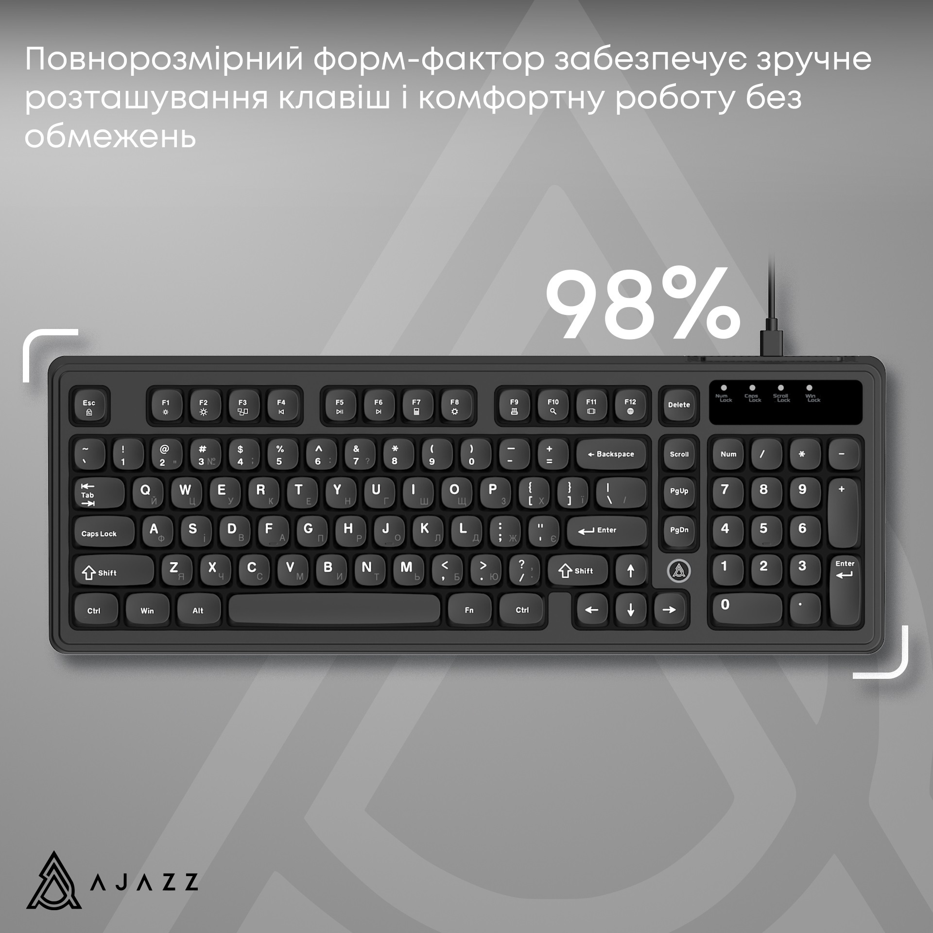 Ajazz AF98 — універсальна дротова мембранна клавіатура, що поєднує практичний формфактор, тиху роботу та сучасний дизайн.