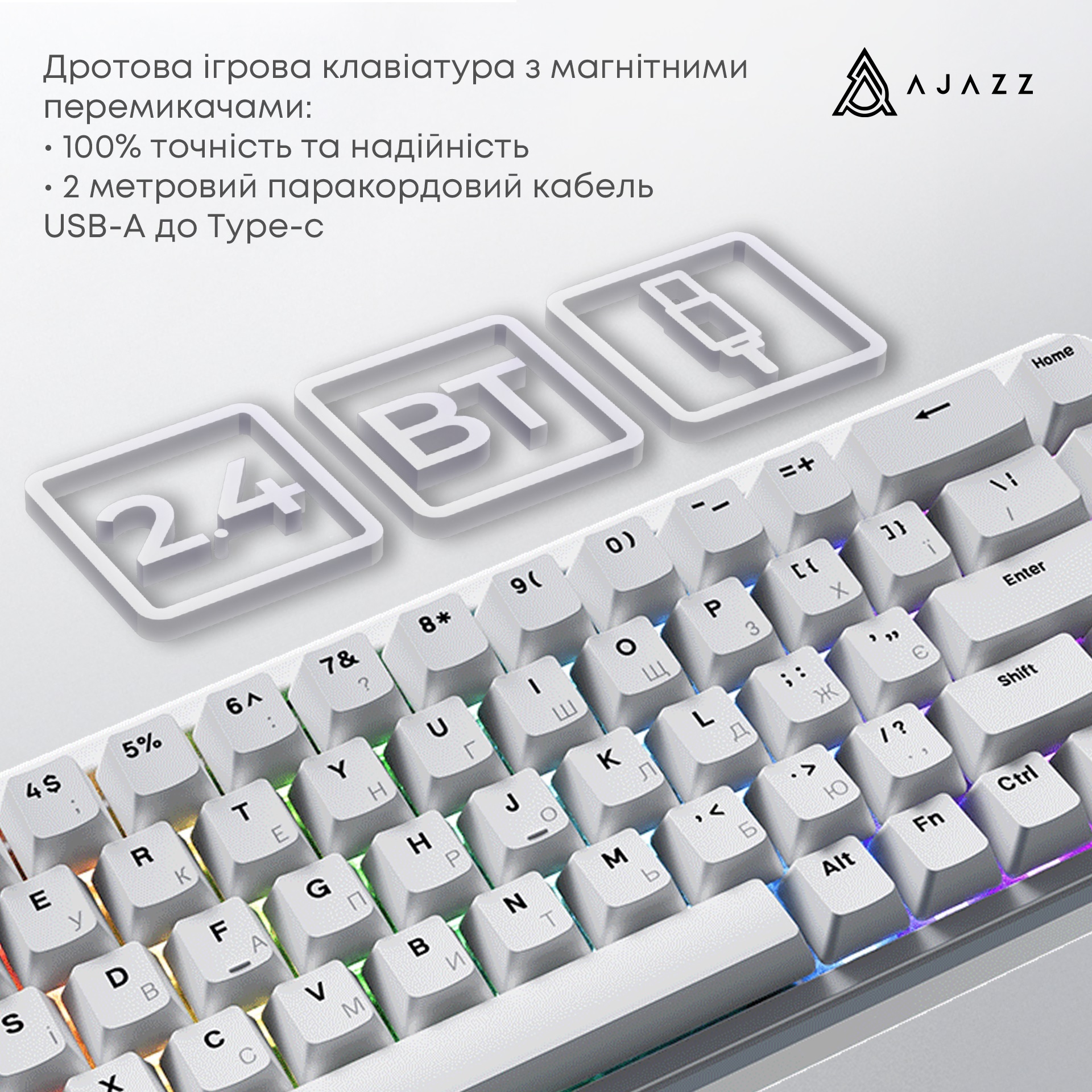 Ігрова клавіатура Ajazz AK680 MAX — це високотехнологічна механічна клавіатура, створена для геймерів і ентузіастів, які прагнуть максимальної швидкості, точності та стилю. Ця модель поєднує передові магнітні перемикачі Magnetic Switch, компактний 68% формат і яскраве RGB-підсвічування з 1.6 млн кольорів. У білому кольорі з алюмінієвою пластиною та шумопоглинальною PORON-піною, AK680 MAX забезпечує блискавичну реакцію та комфорт для ігор і роботи.