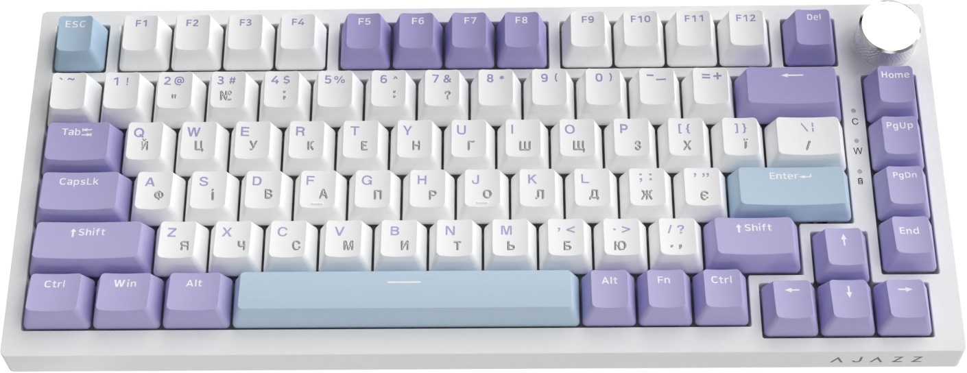 Ajazz AK820 побудована на gasket-платформі, яка пом'якшує відбиття звуку та вібрації під час натискань. Це надає набору характерний м'який і «пружний» відгук, що відрізняє gasket-клавіатури від бюджетних аналогів із жорстким кріпленням плати. Кейкапи виготовлені з PBT-пластику — матеріалу, що зберігає фактуру поверхні та стійкий до жиру. Такі ковпачки служать значно довше, ніж стандартні ABS-аналоги.
