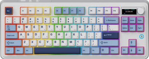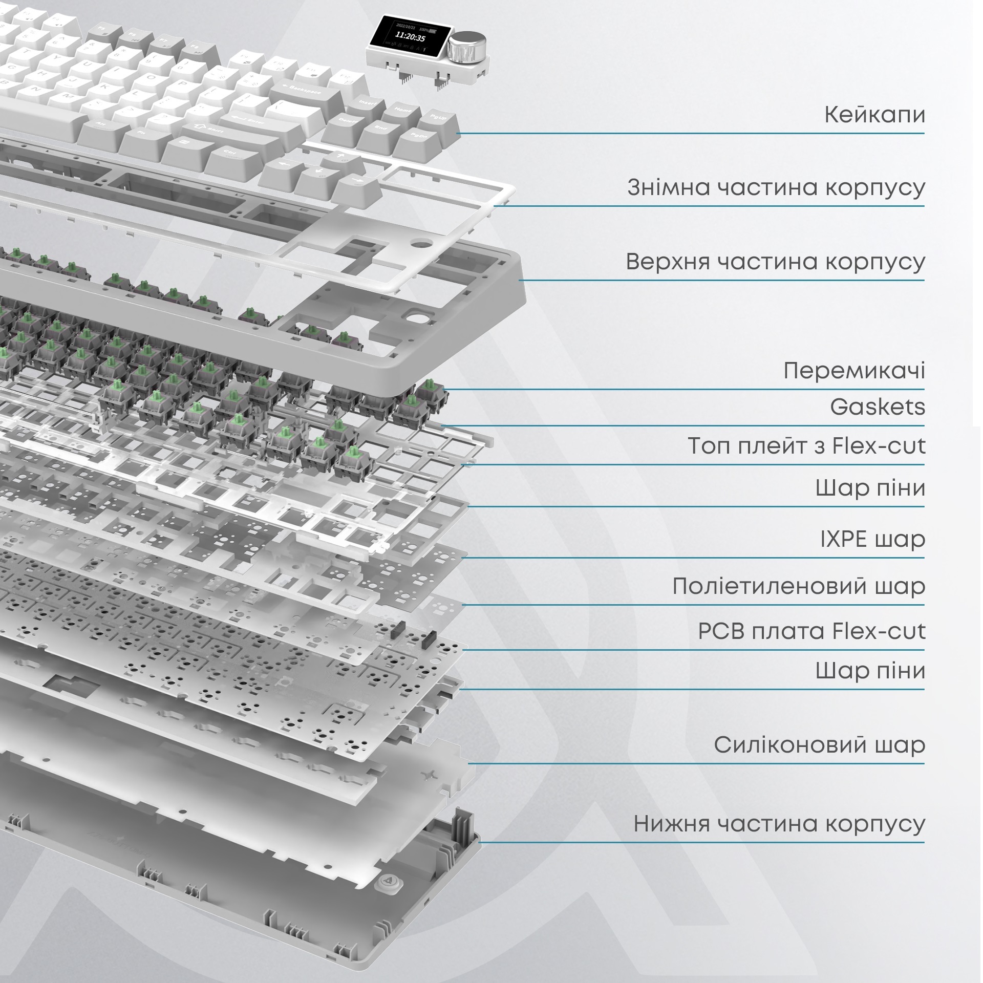 Конструкція AK870 Plus використовує Gasket-Mount дизайн із п’ятьма шарами шумопоглинання (дві поролонові прокладки Poron, IXPE-прокладка під перемикачі, PET-прокладка для підсилення звуку, силіконова основа), що забезпечує тихий і м’який набір із приємним "thocky" звуком. RGB-підсвічування із 16.8 млн кольорів і 20 ефектами, включаючи музичну синхронізацію, доповнює дизайн із PBT-кейкапами в OEM-профіль із чіткими легендами для основних і другорядних функцій. Двошарові регульовані ніжки та протиковзні гумові накладки забезпечують ергономіку та стабільність.