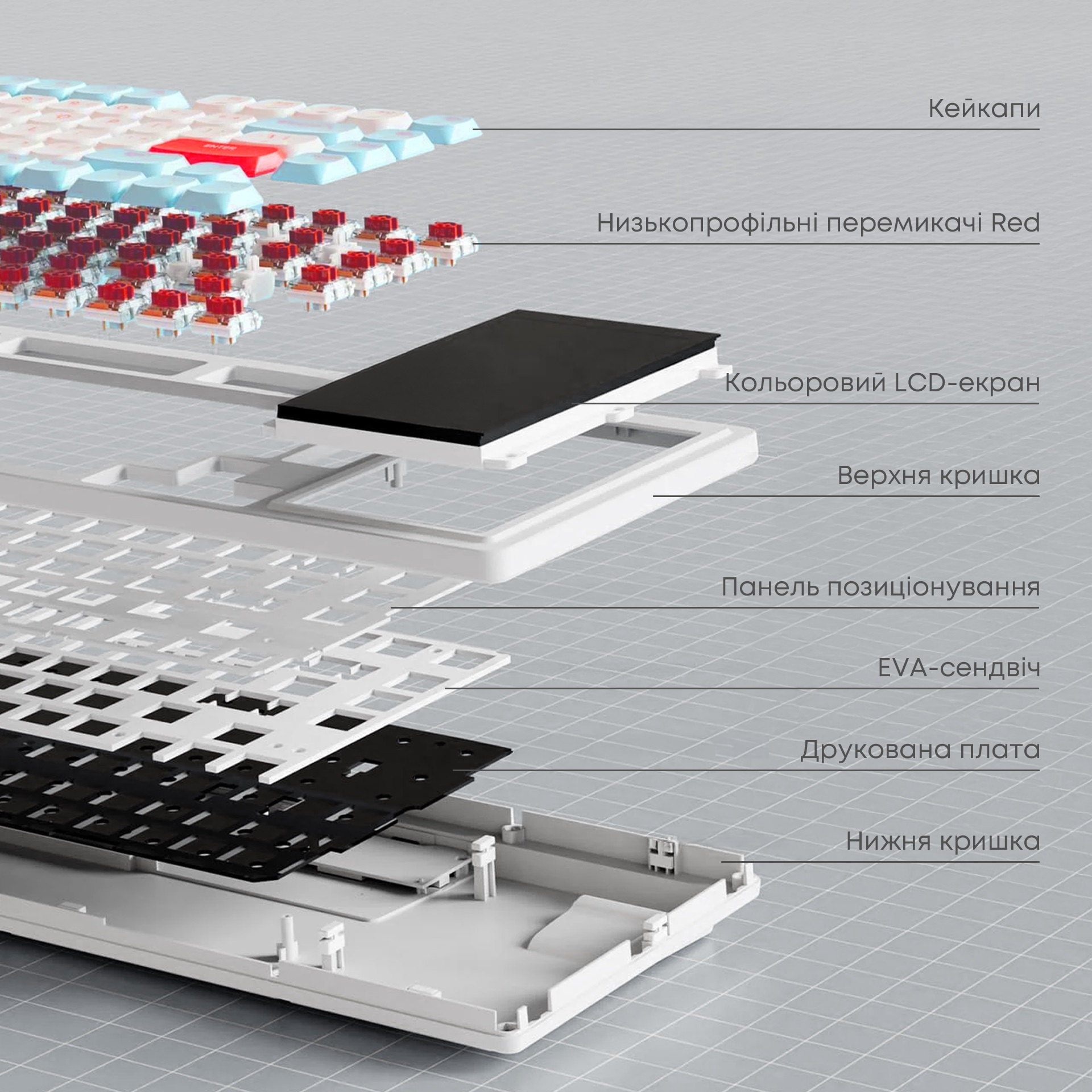 Ajazz AKP815 оснащена низькопрофільними лінійними перемикачами Red Switch (загальний хід 3.0 мм, попередній хід 1.8 мм, сила натискання 45 г), які забезпечують плавне, швидке та тихе натискання, ідеальне для змагальних ігор, таких як шутери чи MOBA, а також для комфортного набору тексту. Частота опитування 1000 Гц у дротовому режимі (затримка 1 мс) гарантує швидку реакцію. Компактний 75% формат (81 клавіша) включає стрілки, функціональні клавіші та цифровий блок, оптимізуючи простір на столі. 4.33-дюймовий сенсорний LCD-екран із 15 програмованими клавішами дозволяє налаштовувати іконки, запускати програми, відкривати вебсайти чи керувати медіа одним дотиком, а також може функціонувати як цифровий блок. Підтримка Hot-Swap для 3/5-пінових низькопрофільних перемикачів забезпечує легку кастомізацію, а NKRO гарантує точне спрацьовування всіх клавіш. Дротове підключення через USB-C забезпечує стабільну та швидку передачу даних і сумісність із Windows і Mac, а два незалежні драйвери дозволяють налаштовувати RGB і функції екрана.