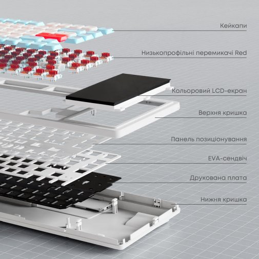 Конструкція AKP815 використовує Gasket-Mount дизайн із п’ятьма шарами шумопоглинання (Poron-піна, IXPE-прокладка, PET-прокладка, силіконова основа, EVA-прокладка), що забезпечує тихий і м’який набір із приємним "thocky" звуком. PC-пластина додає пружності та стабільності, зменшуючи металеві відлуння. RGB-підсвічування із 16.8 млн кольорів і 20 ефектами, включаючи музичну синхронізацію, доповнює білий дизайн із ABS-кейкапами потрійного лиття в OEM-профіль із чіткими легендами. Низькопрофільний дизайн зменшує навантаження на зап’ястя, а двошарові регульовані ніжки та протиковзні гумові накладки забезпечують ергономіку та стабільність. Комплектація включає USB-C кабель, пулер для кейкапів і перемикачів та інструкцію.