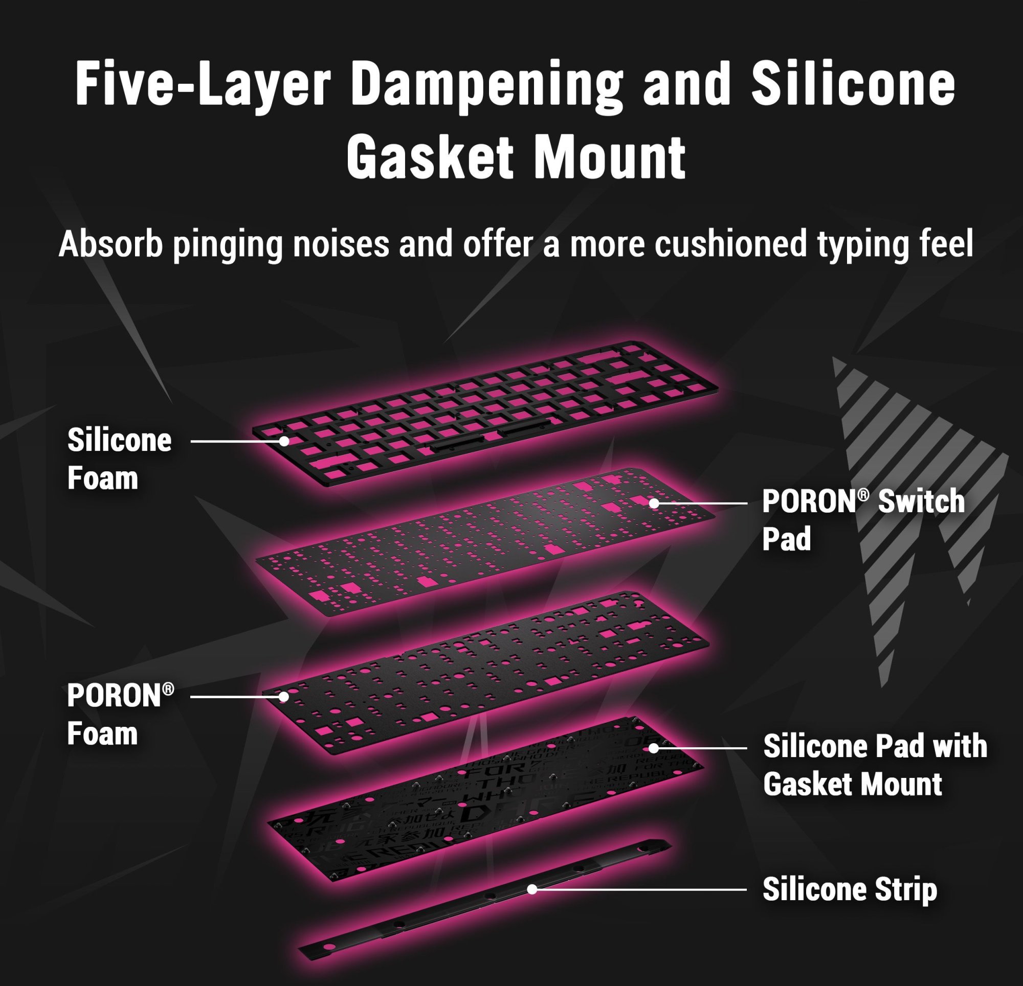 Формфактор 65% економить простір на столі, зберігаючи всі необхідні клавіші, включаючи стрілки, для зручного геймінгу та роботи. Компактний корпус із пластику, вагою лише 915 г, доповнено п’ятишаровою системою шумозаглушення та силіконовими прокладками для м’якого, тихого набору тексту. Три регульовані кути нахилу дозволяють налаштувати клавіатуру для максимального комфорту.
