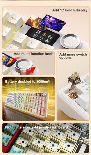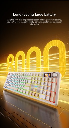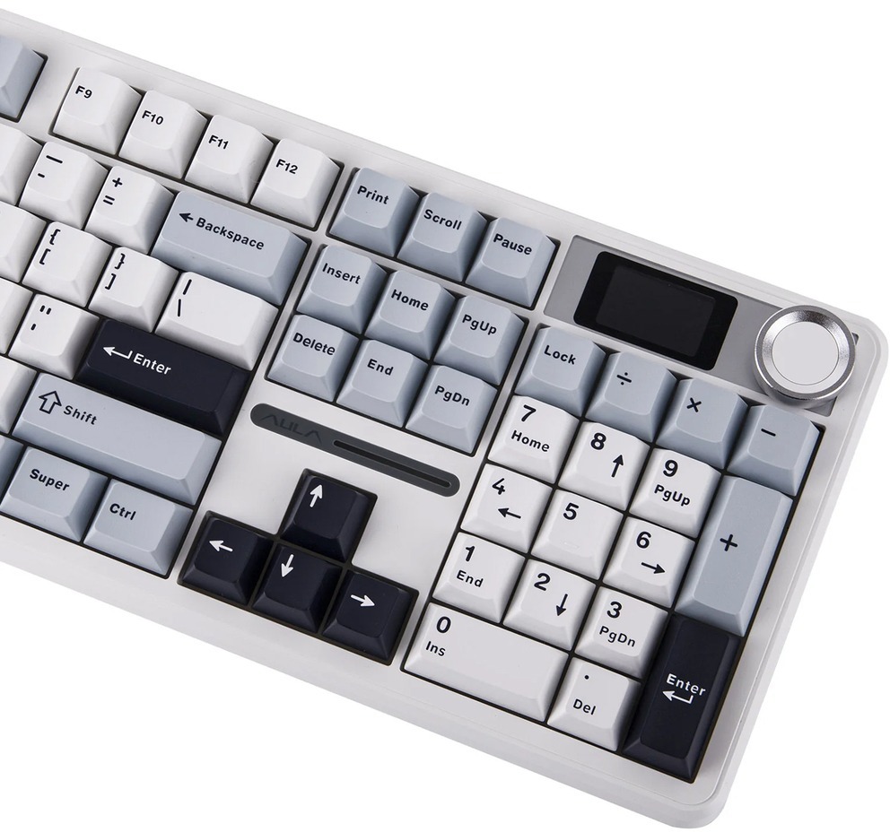 Інтегрований дисплей на клавіатурі показує інформацію про режими, статуси та налаштування, а поворотний регулятор додає зручності керування звуком та підсвіткою.