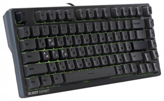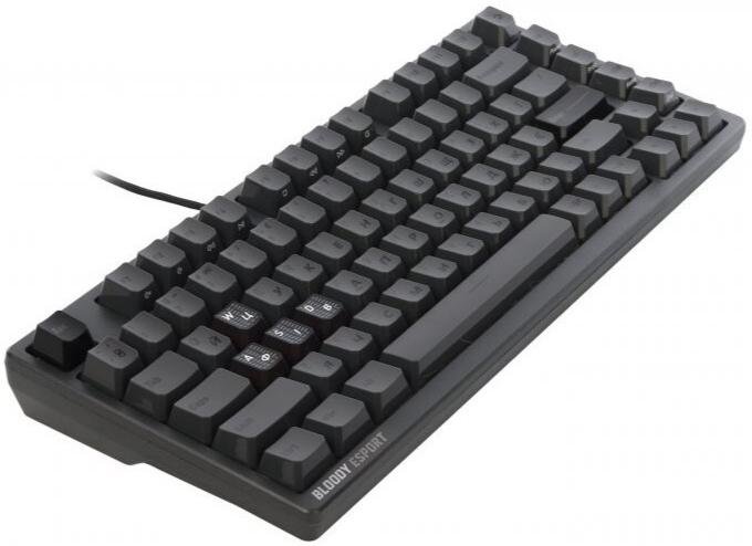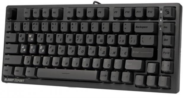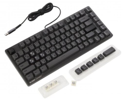 Клавіатура пропонує детальну кастомізацію через фірмове ПЗ Bloody MS Magnetic Axis Esports Assistant: налаштування макросів, глибини натискання та RGB-підсвічування. Чотири кейкапи WASD виконані з міцного PBT-пластику з матовим покриттям, решта — з ABS. Друкована плата захищена нанопокриттям від вологи, а посилені стабілізатори усувають хитання клавіш. Компактний 82-клавішний формат економить 25% місця на столі, а два кути нахилу (3° та 8°) дозволяють підлаштувати посадку під себе. У комплекті — 6 змінних кейкапів, 4 запасні перемикачі та інструменти для заміни.