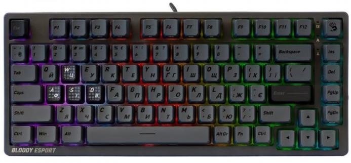 Серце клавіатури — магнітні перемикачі Bloody MS із функцією гарячої заміни. На відміну від традиційних механічних перемикачів, вони використовують датчики Холла, що усуває механічний знос і гарантує ресурс до 100 мільйонів натискань. Зусилля спрацьовування складає 25 ±5 сН, загальний хід клавіші — 3,5 мм. Такі параметри забезпечують чіткий тактильний відгук без зайвого шуму — багатошарові силіконові прокладки гасять резонанс і роблять набір по-справжньому тихим.