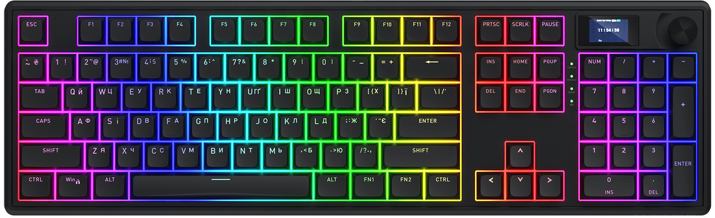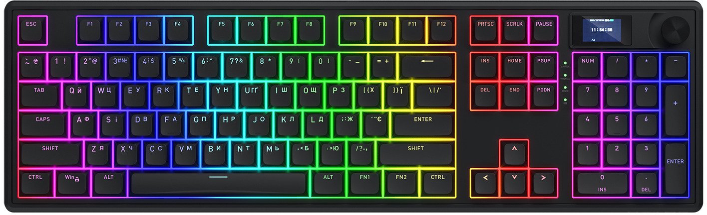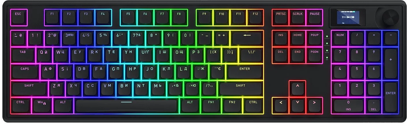 Однією з ключових переваг є універсальне tri-mode підключення: провідне через USB, бездротове Bluetooth 5.3 або 2.4 ГГц з низькою затримкою. Акумулятор ємністю до 8000 мАг гарантує тривалу автономну роботу, а повна підтримка N-Key Rollover і частота опитування 1000 Гц роблять її ідеальною для інтенсивного геймінгу. Крім того, інтегрований TFT-екран відображає корисну інформацію, а зручна ручка дозволяє швидко керувати мультимедіа.