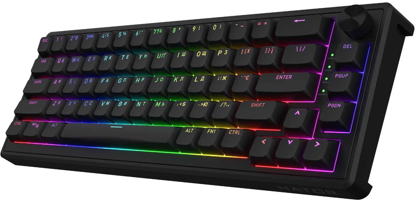 Компактний 65% формат (без цифрового блоку, але з повноцінними функціональними клавішами та стрілками) звільняє простір на столі для миші, дозволяючи робити швидкі рухи в шутерах, MOBA чи батл-роялях. Повна відсутність зайвих клавіш не заважає — усі необхідні команди доступні через Fn-комбінації, а мультимедійний регулятор гучності на верхній панелі додає зручності для швидкого контролю звуку без відриву від гри.