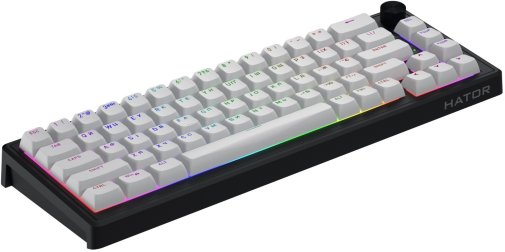 Конструкція клавіатури побудована за принципом gasket mount з еластичними прокладками, багатошаровою звуко- та віброізоляцією, а також вручну змащеними POM-стабілізаторами. Це дає м’який, приємний і гармонійний звук під час набору тексту, мінімізує вібрації та робить тайпінг максимально комфортним навіть при тривалій роботі. Перемикачі HATOR Aurum Ice мають ресурс 100 мільйонів натискань, а гаряча заміна дозволяє легко експериментувати з різними свічами без пайки.