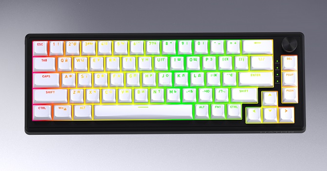 Кейкапи виготовлені з якісного PBT подвійного лиття з профілем OMA, що гарантує довговічність, приємну тактильність і чітке наскрізне RGB-підсвічування. Кожна клавіша підтримує індивідуальну кастомізацію кольору з палітри 16,8 мільйонів відтінків, а бічні панелі додають ще 19 незалежних RGB-зон для створення унікального стилю. Окремо виділяється багатофункціональний кноб, який можна запрограмувати не лише на регулювання гучності, а й на будь-які інші дії через фірмове ПЗ.
