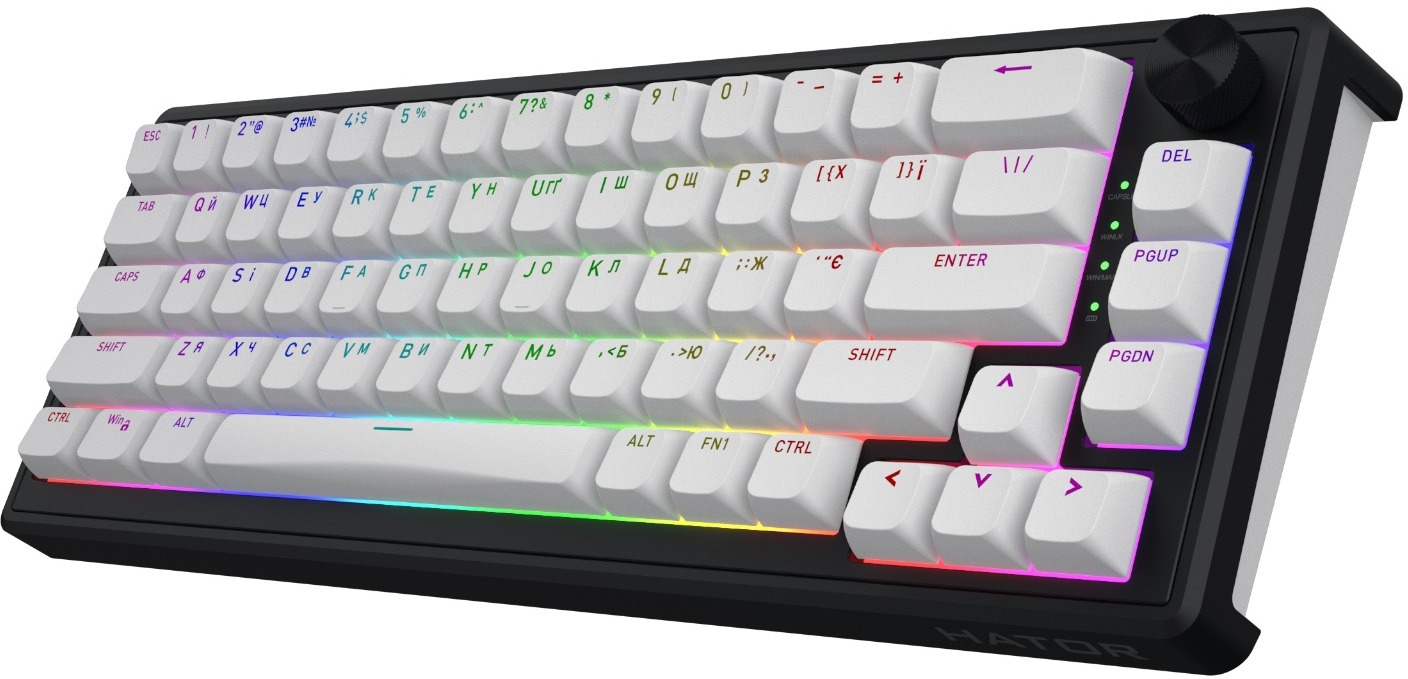 Серце моделі — фірмові лінійні перемикачі HATOR Aurum Sterling, попередньо змащені для надзвичайно плавного ходу без тертя. Сила натискання 50 ±10 г, хід до спрацьовування лише 1,2 ±0,4 мм, повний хід 4 ±0,4 мм — це забезпечує блискавичну швидкість і мінімальний шум. Ресурс кожного перемикача — 70 мільйонів натискань, а підтримка hot-swap дозволяє легко міняти свічі без паяння для персоналізованого відчуття.