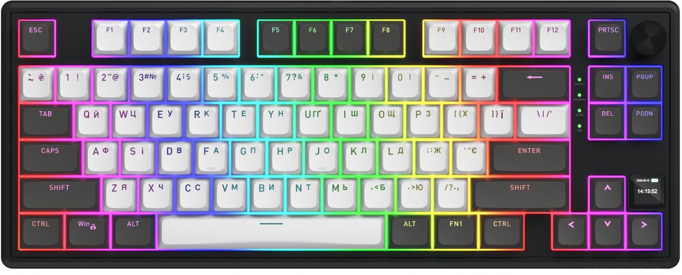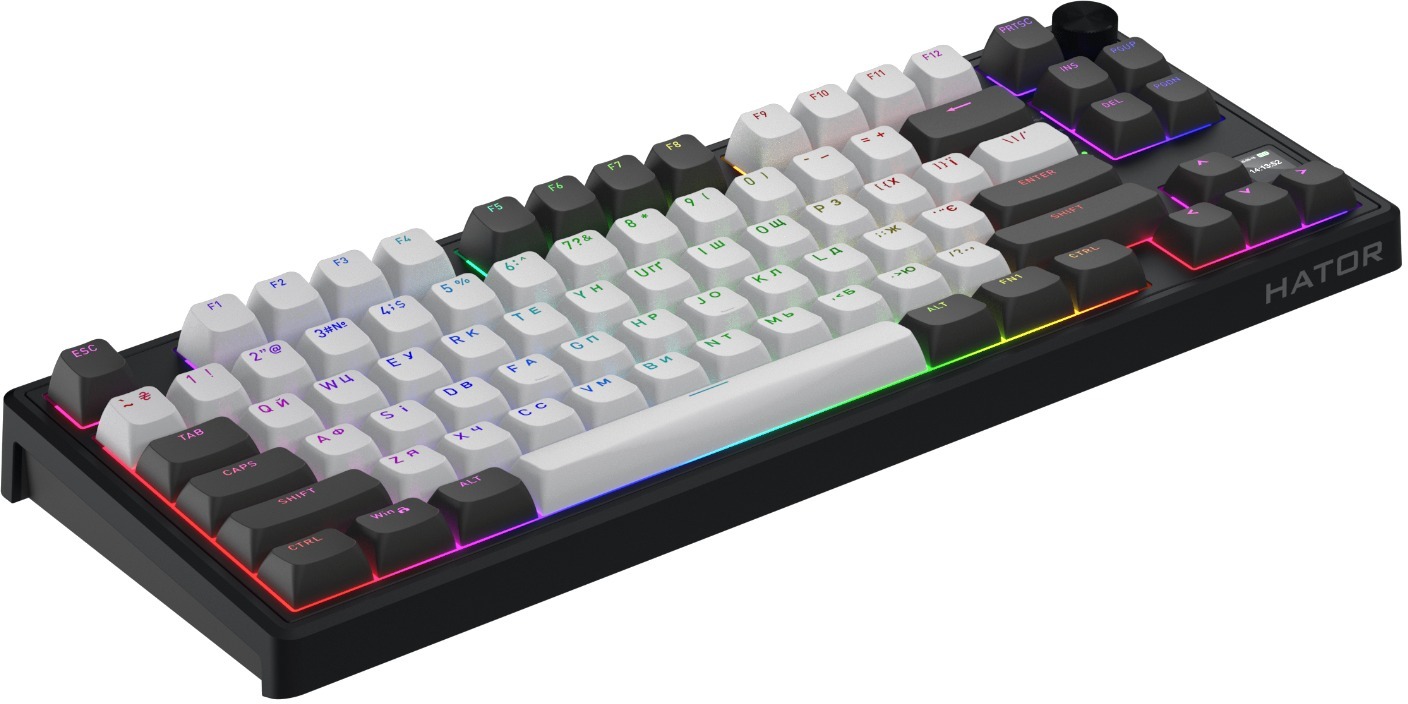 Ця 80% TKL-модель у стильному сіро-чорному кольорі базується на HATOR Aurum Vanilla Silent — лінійних механічних перемикачах з заводським змащенням, що гарантує м'який хід, мінімальний шум та ресурс до 50 мільйонів натискань, перетворюючи кожне натискання на точний і безшумний сигнал для конкурентних баталій чи тривалого типування, з частотою опитування 1000 Гц для миттєвої реакції. Сумісна з Windows, macOS, клавіатура підтримує три режими підключення — бездротове 2.4 ГГц для низької затримки, Bluetooth для мультипристроїв та дротове USB-C для зарядки та стабільності, роблячи її універсальним інструментом для мультиплатформових сесій без лагів чи розривів, з батареєю подвійної місткості (8000 мАг) для тривалої автономності.