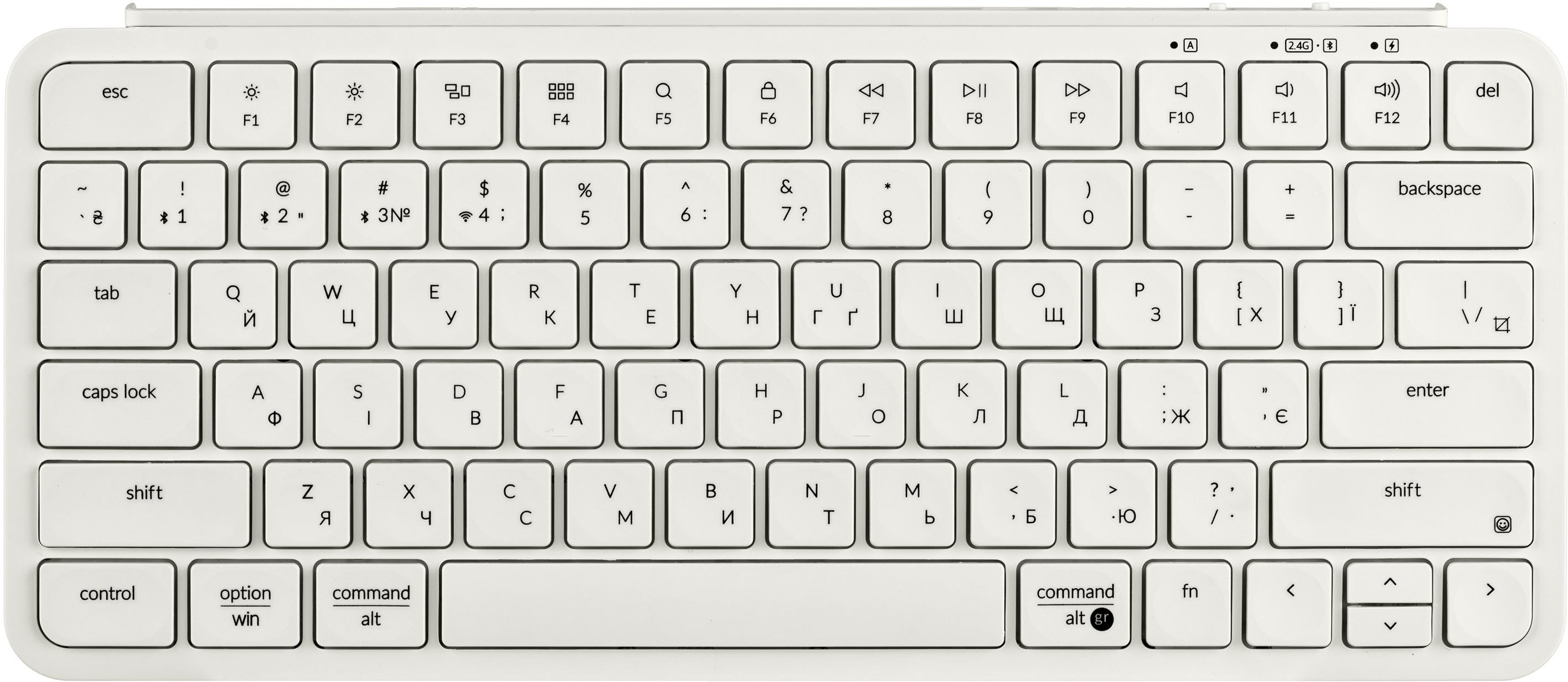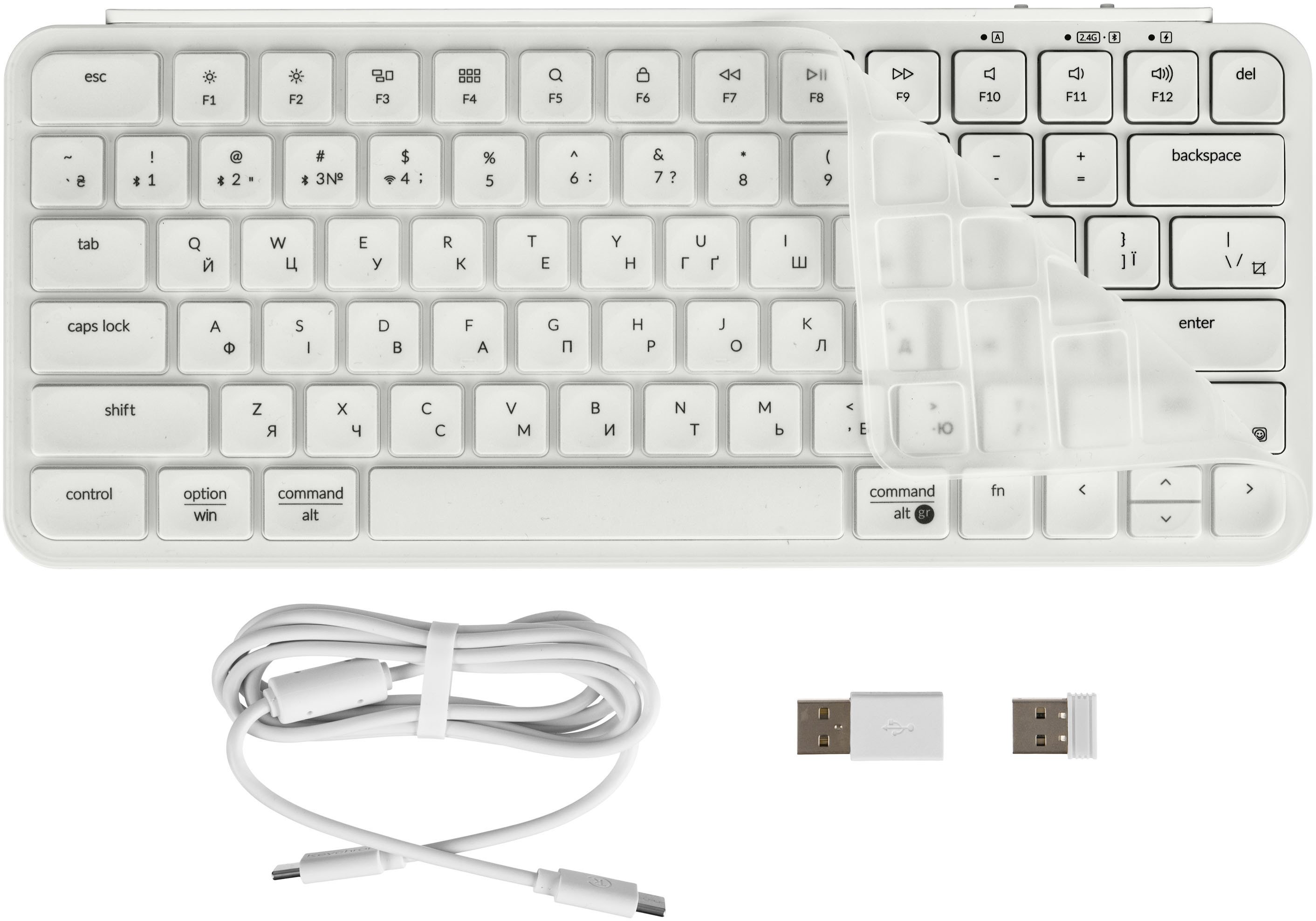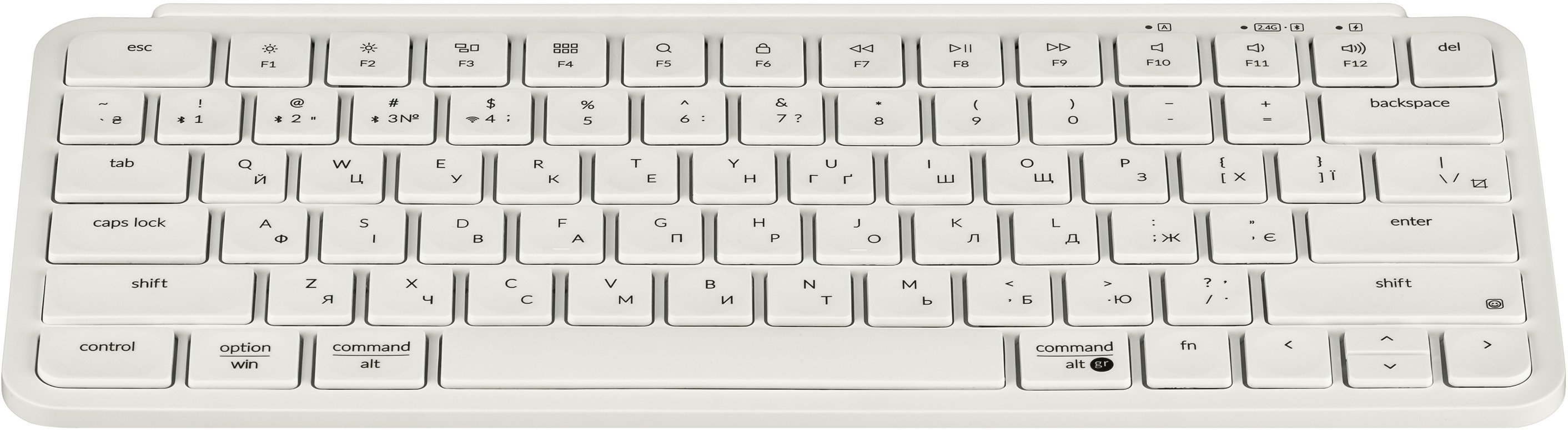 Підключення здійснюється трьома способами: Bluetoothдля одночасного з’єднання з трьома пристроями, 2.4 ГГц через приймач USB-A та дротовим USB-C. Це дозволяє миттєво перемикатися між ноутбуком, планшетом і смартфоном однією клавішею, а автономність гарантує тижні роботи без підзарядки. Мембранні перемикачі забезпечують тихий, м’який і комфортний набір тексту, ідеальний для тривалої роботи.