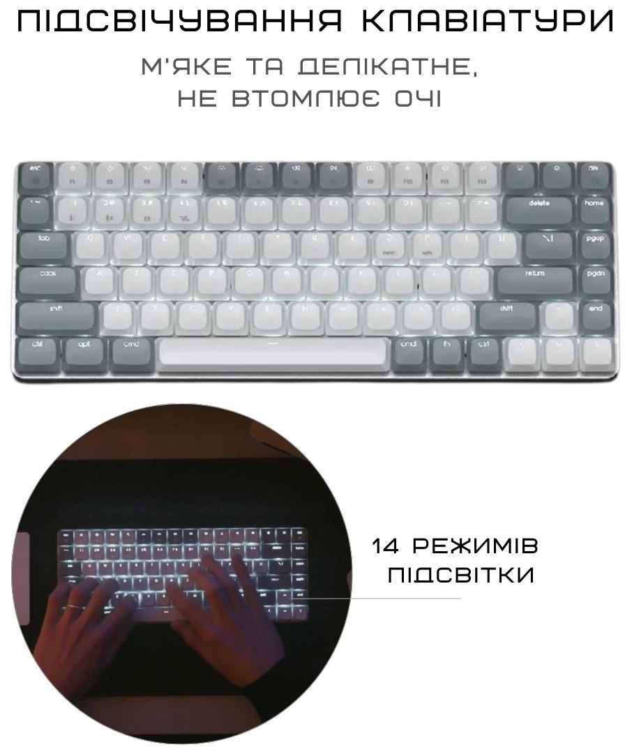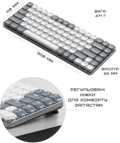 Автономність вражає: до 16,5 годин з увімкненим підсвічуванням і до 2 місяців без нього — заряджається через USB-C, тож вистачає на тижні інтенсивного використання. Корпус з алюмінієвого сплаву зверху та пластиковим дном робить клавіатуру легкою (471 г), міцною та стильною — округлені краї, регульовані ніжки для двох кутів нахилу (для зменшення навантаження на зап'ястя) та компактні розміри роблять її ідеальною для подорожей, офісу чи домашнього столу.