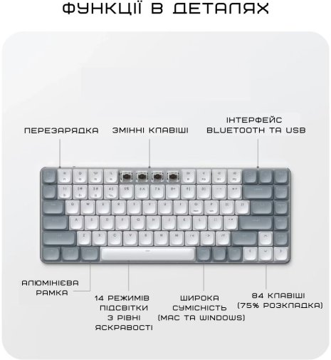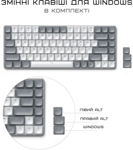 Повна сумісність з macOS та Windows: в комплекті йдуть змінні Windows-кейкапи (Win-ключ, Alt), тож легко перемикатися між екосистемами. Клавіатура має додаткові гарячі клавіші для швидкого доступу до функцій, а механічний механізм забезпечує довговічність і приємний звук під час набору.