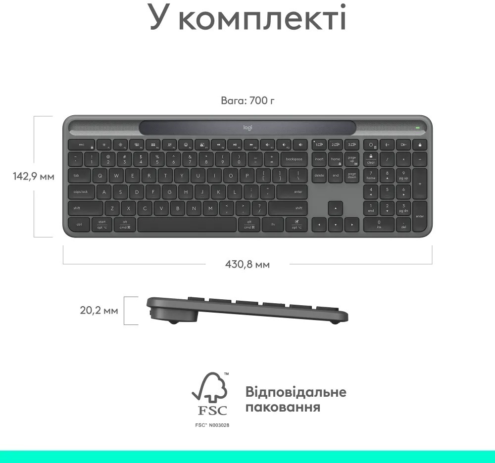 Вбудований акумулятор оптимізований для довготривалої служби до десяти років, що гарантує простоту обслуговування та знижує екологічний вплив. Корпус виготовлений з матеріалів, що містять щонайменше 70% переробленого пластику з післяспоживчих джерел, з алюмінієвою пластиною, виробленою за допомогою відновлюваної енергії, а також FSC-сертифікованою упаковкою, що відповідає принципам стійкості Logitech, роблячи цей пристрій не тільки функціональним, але й відповідальним вибором для свідомих користувачів.