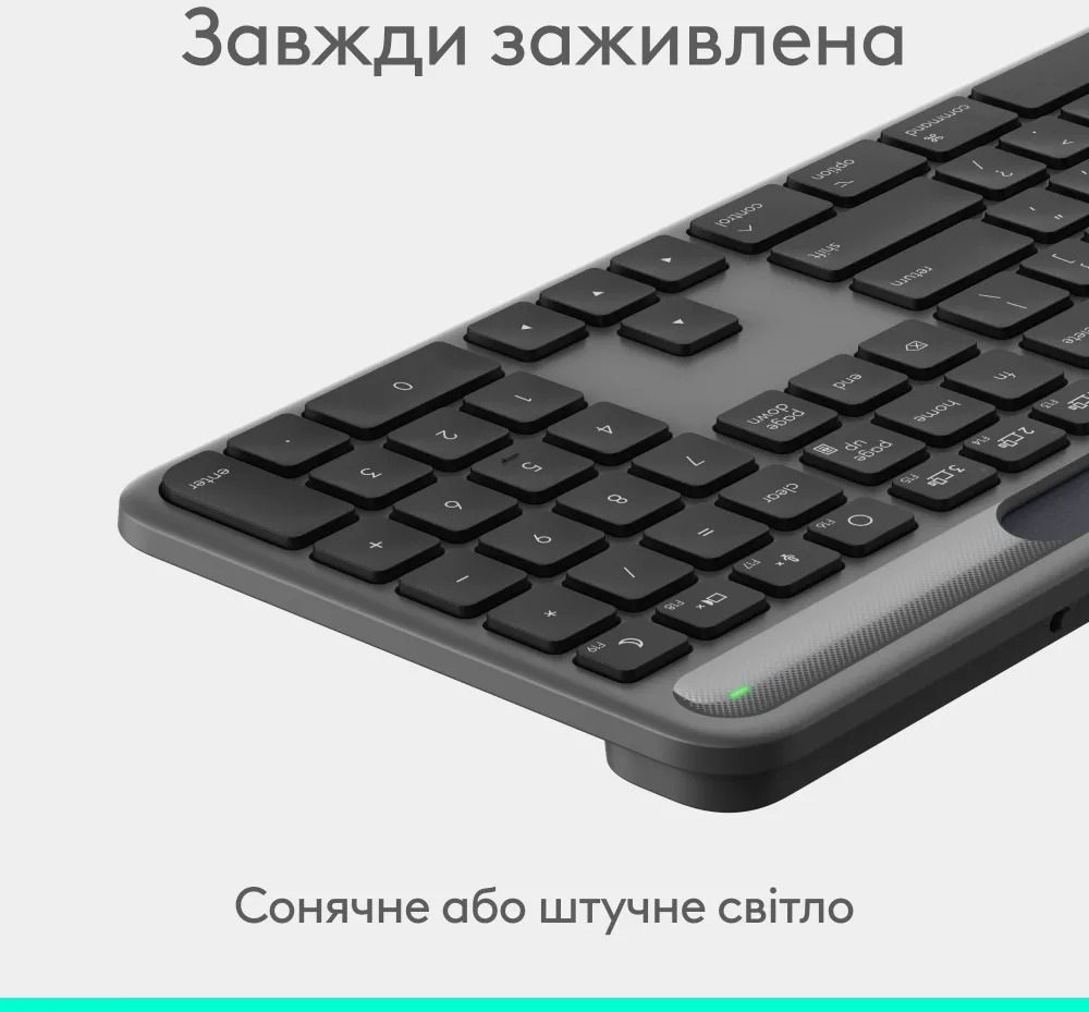 Дизайн клавіатури вирізняється елегантністю та практичністю: компактні габарити з матовим графітовим покриттям, стійким до відбитків пальців і подряпин, поєднуються з антиковзкими клавішами для стабільності під час інтенсивного використання, а сонячна панель на верхньому ребрі органічно вписується в мінімалістичну естетику, створюючи професійний вигляд для сучасного робочого столу.