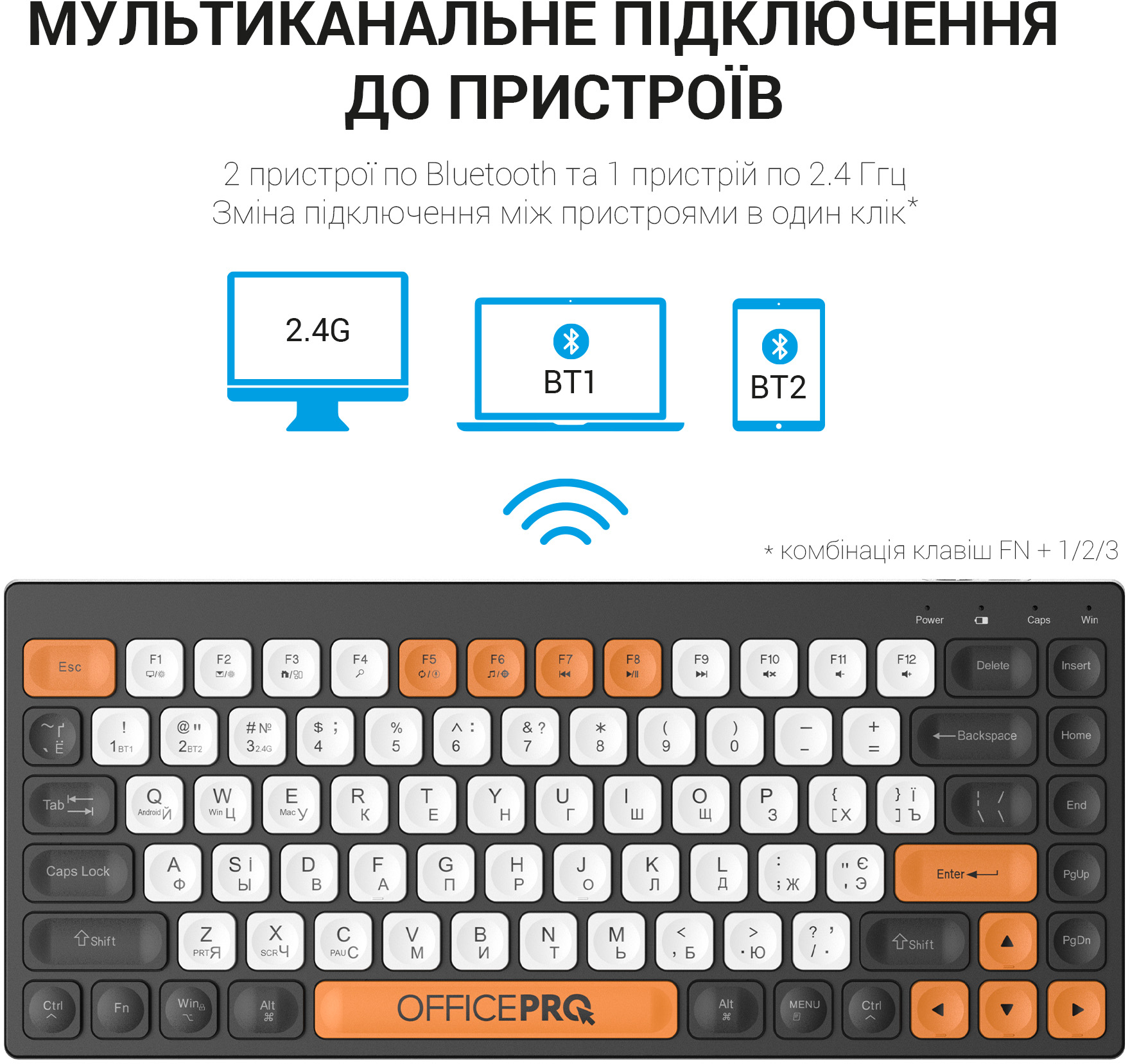 OfficePro SK955 — це універсальна клавіатура, яка працює у двох режимах: бездротовому та через Bluetooth 5.0, що надає вам зручність використання з різноманітними пристроями, такими як комп'ютер, ноутбук, смартфон або планшет. Здатна працювати на відстані до 10 метрів, ця клавіатура створена для того, щоб забезпечити вам швидкий та безперебійний доступ до вашого обладнання.