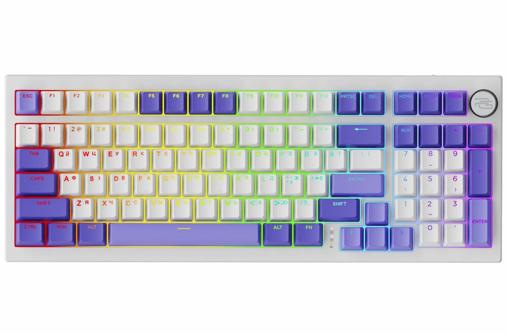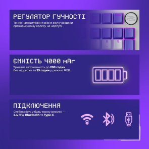 Кількість клавіш: 98Основний колір: ФіолетовийБезпровідні інтерфейси: Bluetooth, Радіо 2.4 ГГцІнтерфейси: USB 2.0Підсвітка клавіатури: ТакВид клавіатури: Ігрова
