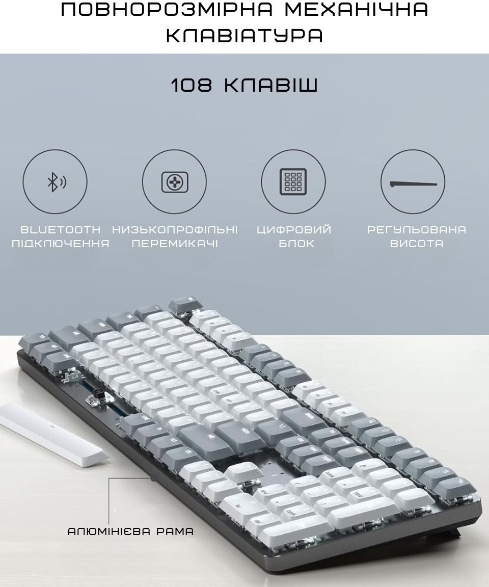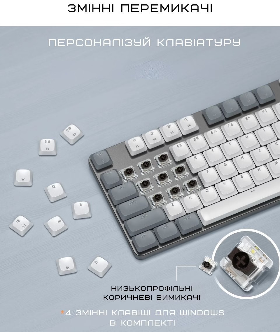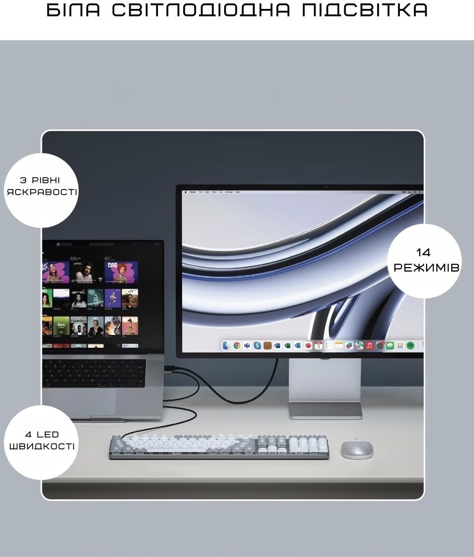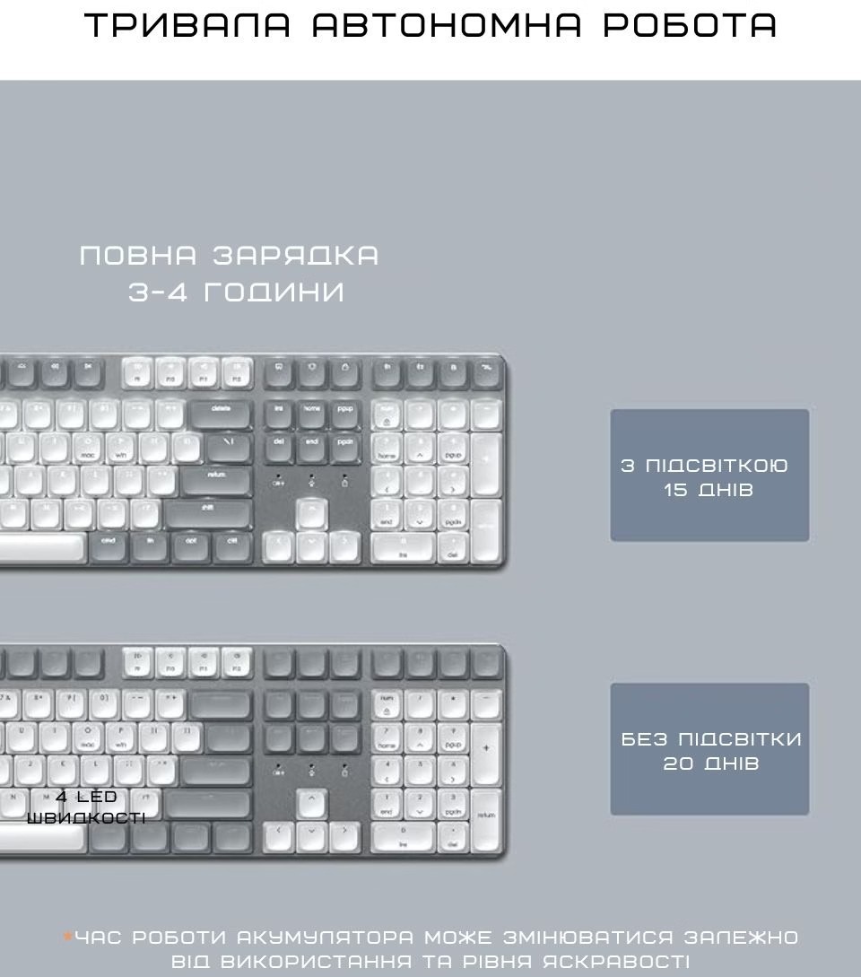 Особливу атмосферу створює м'яке біле підсвічування з 14 різними ефектами, трьома рівнями яскравості та чотирма швидкостями анімації. Воно не лише допомагає працювати в умовах низького освітлення, а й додає затишку робочому простору. Акумулятор ємністю 2500 мАг забезпечує тривалу автономність, а зарядка здійснюється через сучасний порт USB-C. Завдяки низькому профілю клавіш друк залишається комфортним і менш втомливим навіть після багатьох годин використання.