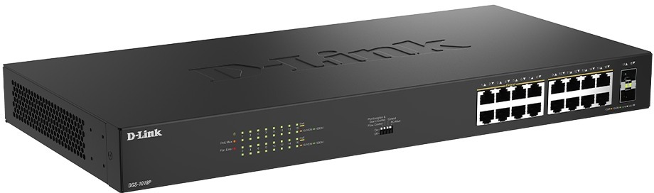 Комутатор D-Link DGS-1018P є потужним некерованим комутатором Gigabit Ethernet з підтримкою PoE+, призначеним для невеликих і середніх мереж. Він оснащений 16 портами Gigabit Ethernet з функцією PoE+ (порти 1-16), які забезпечують передачу даних та живлення по одному кабелю, а також двома портами Gigabit SFP для оптоволоконних з'єднань. Таке поєднання дозволяє легко розширювати мережу, підключаючи пристрої на відстані до 250 метрів у режимі Extend, без необхідності в складному налаштуванні. Корпус комутатора компактний, з металевим виконанням для надійності, а також оснащений 5-швидкісним вентилятором, який автоматично регулює оберти залежно від температури, забезпечуючи тиху та ефективну роботу.