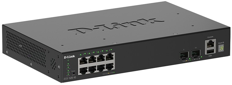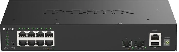 D-Link DGS-1530-10 — це 8-портовий гігабітний стековий керований комутатор із двома 10G SFP+ портами для висхідного з’єднання. Він має статус продукту A1 v1.00 (активний) і підтримує фізичне стекування до 9 комутаторів, що забезпечує гнучке масштабування мережі.